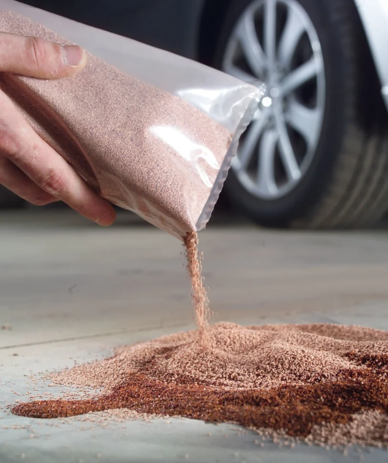 Bước 2: Cắt mở gói, rắc bột làm sạch GreenFilter bao quanh dung dịch tràn đổ để tránh loang rộng. Sau đó tiếp tục rắc bột phủ lên toàn bộ bề mặt dung dịch tràn đổ, loang dính.